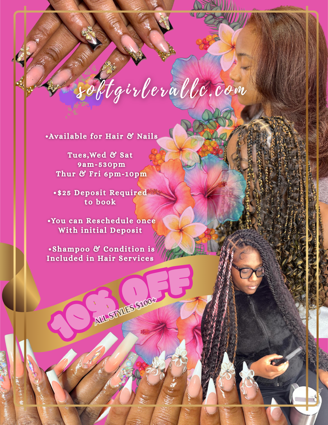Before I discovered cosmetology was a possible career for me, I was just a normal girl going to school & work. After school, or on weekends you would find me braiding a friend or family members hair. It took 9 years for me to decide this would be my full time job, my career in fact. The last 8 years have been a struggle, a blessing and a testimony building a career and a family. With 17 years experience I went from braiding to being a licensed cosmetologist offering hair services & nail services while working part time as an educator for a 600 manicure program. Aside from my career I am married & a full time mother to 3 toddlers. Business minded with a love for family. At Soft Girl Era you start as a client and become forever family.